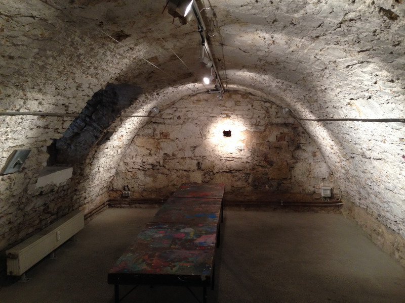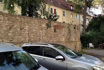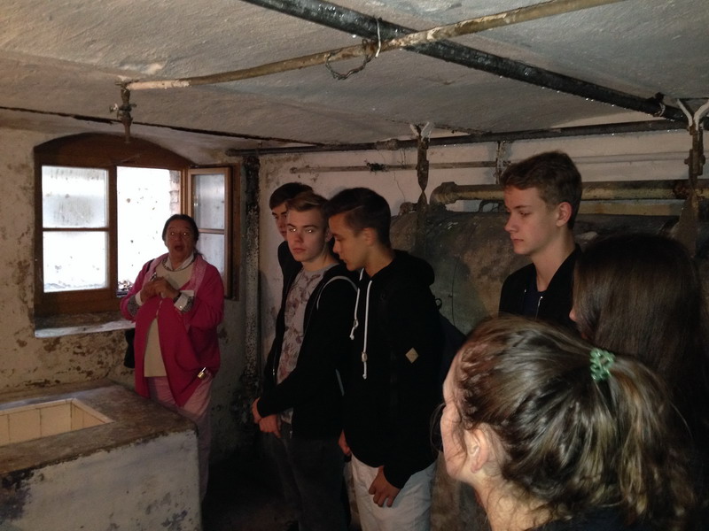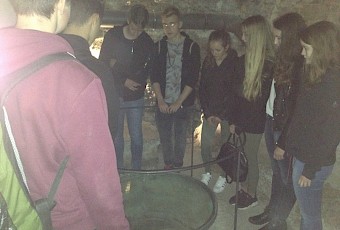 Die zweite Station befand sich ebenfalls in der Roten Straße. Unterhalb der Alten Mensa fand man bei Renovierungsarbeiten Überreste eines ehemaligen Barfüßer-Klosters. Heute stehen dort Häuser von der Roten Straße bis zum Wilhelmsplatz. Wir besichtigten einen aus dem 13. Jahrhundert stammenden Gewölbekeller, der sich in neun Meter Tiefe befand und von aufwendig gemauerten Rundbögen umsäumt war. Aufgrund mehrerer Öffnungen im Deckengewölbe und des strukturellen Aufbaus des Raumes erkannten die Schülerinnen und Schüler recht schnell, dass es sich um eine Sickergrube und damit um die Mönchstoilette handelte. Glücklicherweise waren in dieser Hinsicht keine Überreste oder Gerüche wahrnehmbar. Oberhalb dieses Raumes saßen damals die Mönche in der „Schwatzkammer“, unterhielten sich und verrichteten gleichzeitig ihr Geschäft. Durch die neun Meter Tiefe entstand eine große Distanz zu den Fäkalien, was für die damalige Zeit fortschrittlich und auch hygienisch war. Aufgrund der Größe des Raumes musste dieser nur etwa alle 15 Jahre von einem Anbieter unreiner Dienste (z.B. Totengräber) kostspielig geleert werden. Dieser verdiente sich nach vollendeter Arbeit noch etwas mehr dazu, indem er die Exkremente den Bauern der benachbarten Dörfer als „Superdünger“ verkaufte. Es ist beeindruckend, dass der Bau seit über 800 Jahren immer noch hält. Das bietet Archäologen und Historikern bemerkenswerte Einblicke in das Alltagsleben der Mönche.