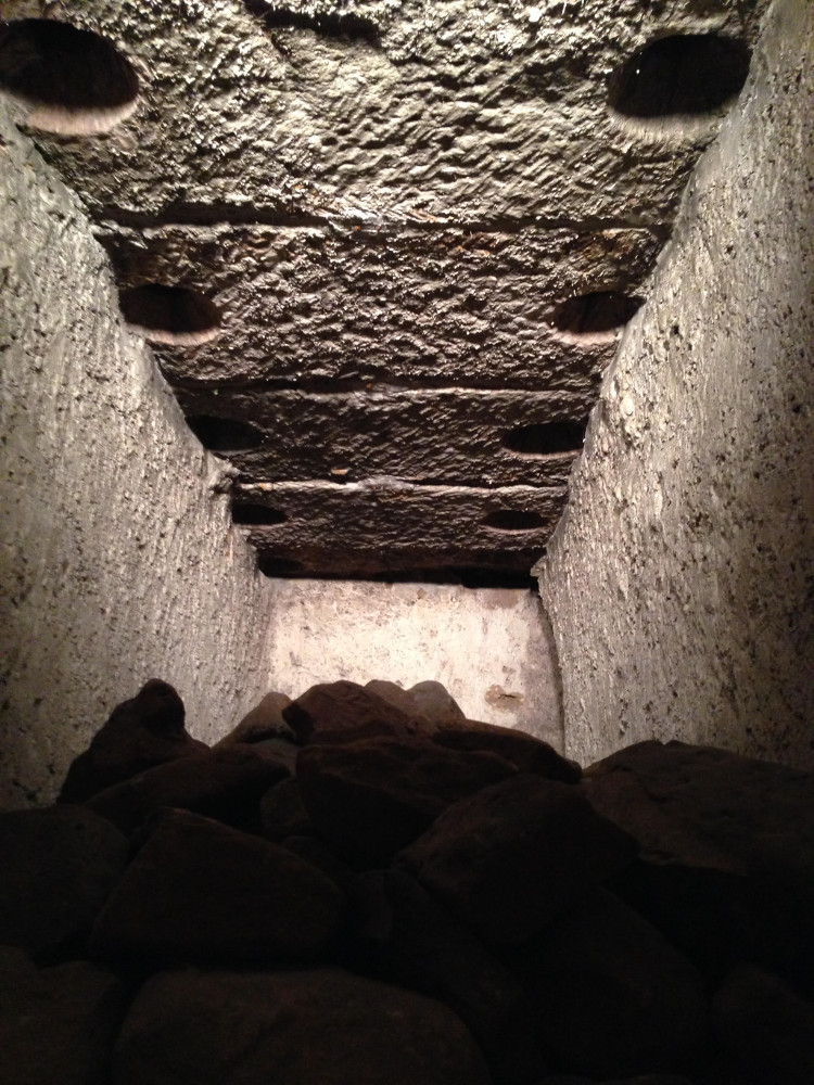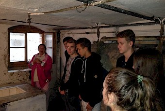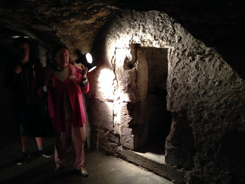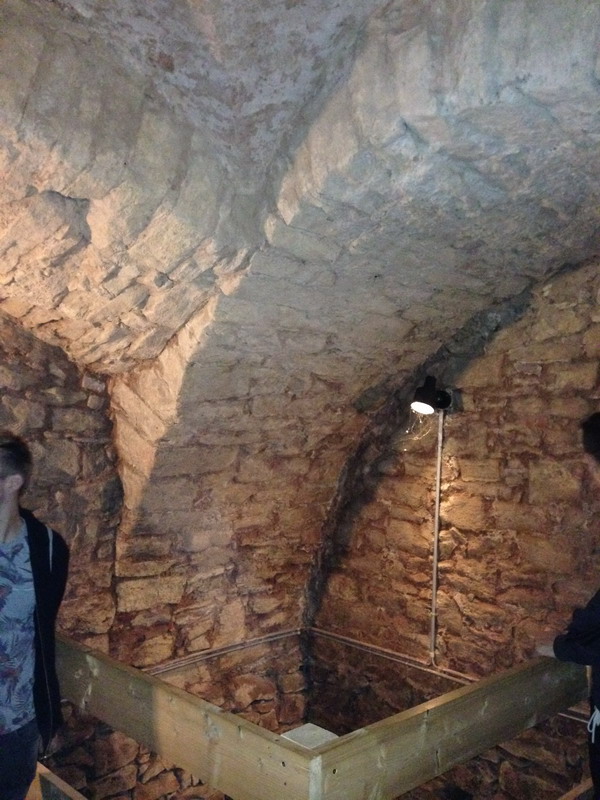Die letzte Station führte uns zum „Heizungsraum“ des alten Rathauses. Das alte Rathaus besaß bereits im Mittelalter eine eigene Fußbodenheizung. Dazu wurden unter dem Gebäude mit einem Feuer spezielle Steine erhitzt, die die Wärme besonders gut speichern konnten. Die Wärme stieg dann durch Lüftungsschlitze nach oben bis zum Fußboden des Ratssaals auf. Dieses System hatte jedoch zwei Nachteile: zum einen entstand auf diese Weise zu Beginn eine extreme Hitze, die im Laufe des Tages immer weiter abnahm, da nicht kontinuierlich geheizt werden konnte und zum anderen reichte die hohe Temperatur nicht aus, um den gesamten Raum zu erwärmen. Daher saßen die Ratsmitglieder über den Lüftungsschlitzen auf einem Schemel in ihrem Bekleidungsrock, damit die Wärme direkt ihren Körper und nicht den ganzen Raum erwärmte. Das Heizungssystem wurde später durch einen verbesserten Ofen im Ratssaal ersetzt, wodurch der Heizungskeller umfunktioniert werden konnte. Im 16. und 17. Jahrhundert wurden die Räumlichkeiten als Gefängnis für die Göttinger Bürger, die z.B. ihre Steuern nicht gezahlt hatten, genutzt. Aus dieser Zeit sind auch noch zahlreiche „Graffiti“ (eingeritzte Namen und Daten) zu sehen.