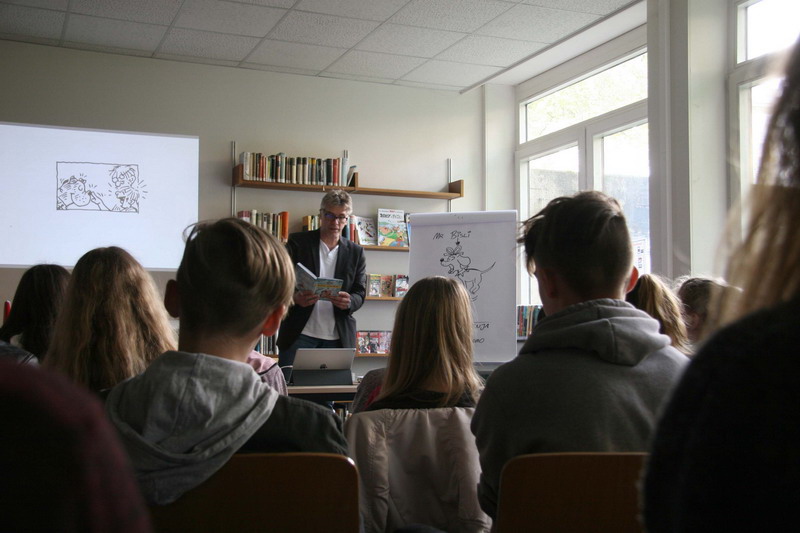 Zwei spannende Lesestunden mit dem Autor Hans-Jürgen Feldhaus und einem abenteuerlichen Buch haben die beiden Klassen 7k1 und 8k1 in der Bibliothek erlebt. Am Freitag, 12.05. hat der Autor in der Bibliothek des FKG im Rahmen der niedersächsischen Schülerlesetage sein Buch "Quinn und Spencer - Zwei Checker, kein Plan" vorgestellt.