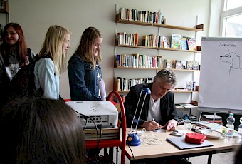 Zwei Checker? - Quinn, der sich ständig verläuft und im nächtlichen Wald über Leinen stolpert, und sein Hund Spencer, der auch alles Andere im Kopf hat als den richtigen Weg nach Hause, ließen keine Langeweile aufkommen. Dazu hatte Herr Feldhaus noch viele eigene Zeichnungen mitgebracht und seine Protagonisten vor Ort gleich live gezeichnet, denn er ist nicht nur Autor, sondern illustriert seine Bücher auch selbst.