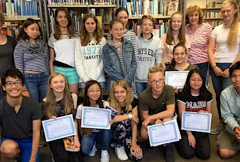 In der angenehm kühlen Bibliothek fand der 'English Reading Contest' der 7. Klassen statt. Wie jedes Jahr traten wieder die jeweils besten Leserinnen und Leser ihrer Klasse gegeneinander an. Um es vorweg zu sagen: alle haben wirklich sehr gut gelesen. Die drei Gewinner waren: 1. Preis: Meihuan Wang, 7bil, 2. Preis: Vera Henriksson, 7mn, 3. Preis Catarina Soares, 7k2. Herzlichen Glückwunsch! Meihuan wird dann in der kommenden Woche beim Stadtentscheid für das FKG antreten.