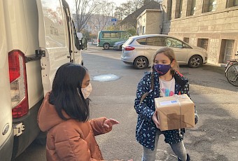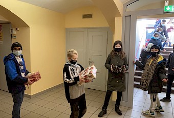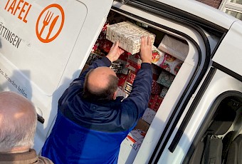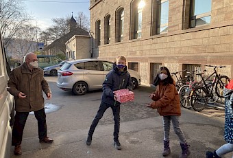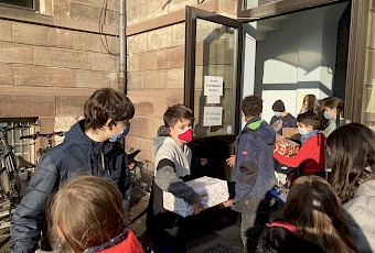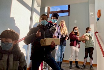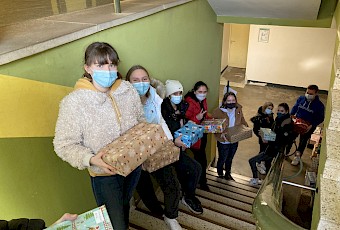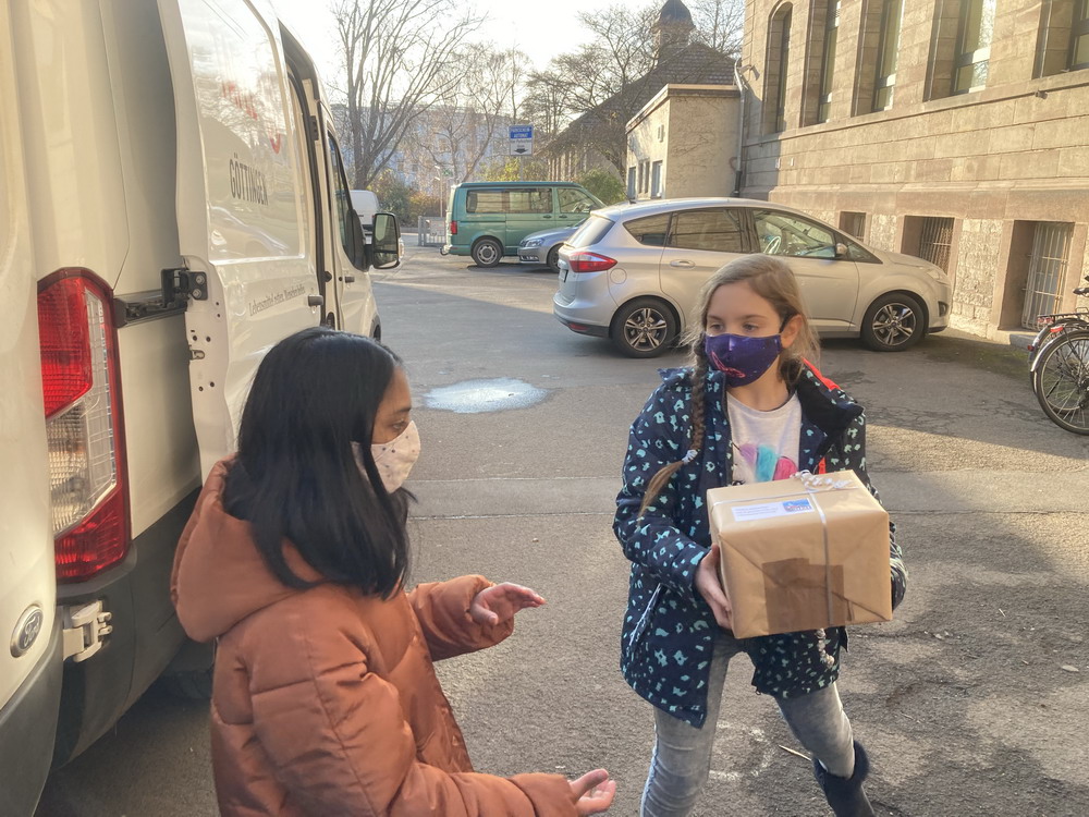 Die Klasse 6bil hatte schon alle Hände voll zu tun, als sie die Päckchen aus dem bis zur Decke gefüllten Lernmittelraum in den Wagen der Göttinger Tafel transportierte. Und der Platz war schon über die Hälfte gefüllt, dann ging es weiter zum großen Felix, wo die 11k4 bereit stand, tatkräftig mitzuhelfen. Der freie Platz im Transporter wurde weniger und weniger, zuletzt mussten die Päckchen sogar mit auf den Beifahrerplatz, da der Laderaum randvoll beladen war.
