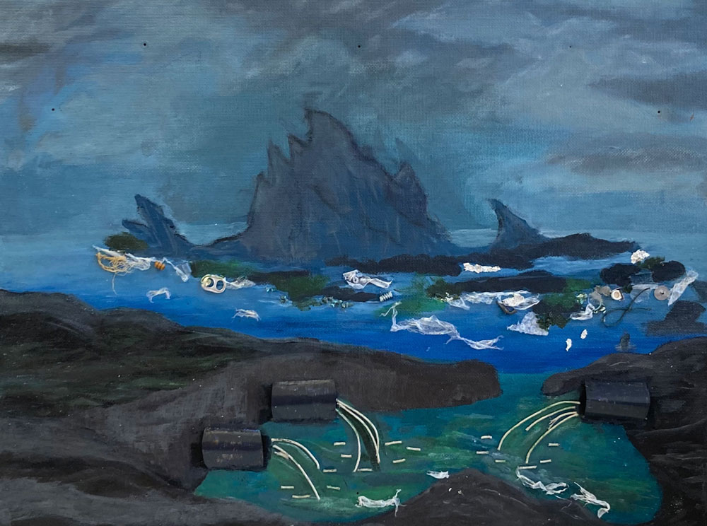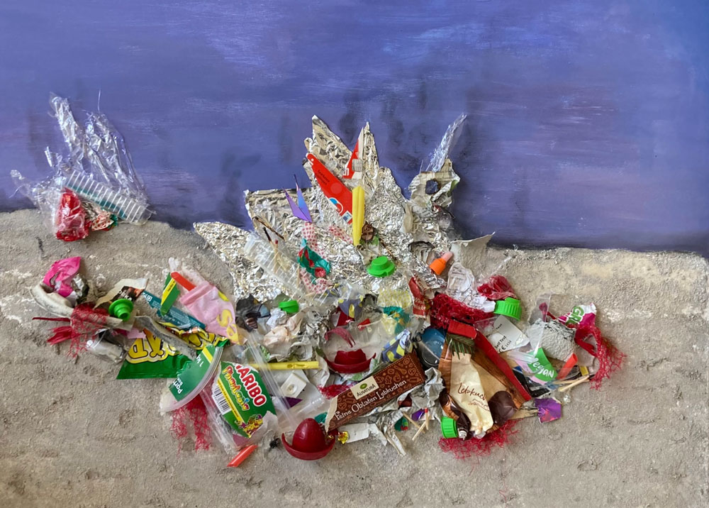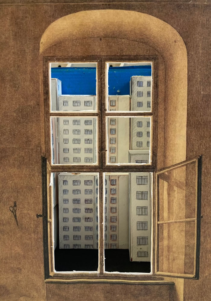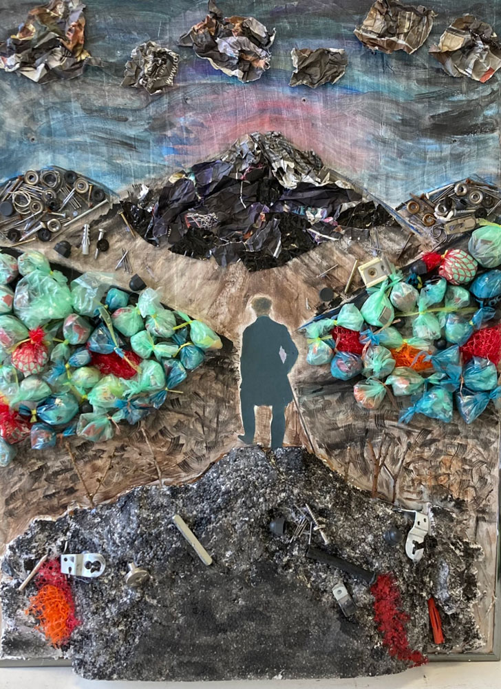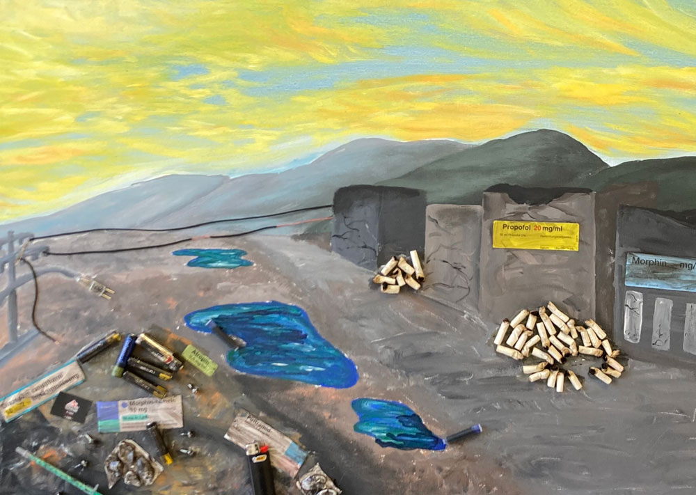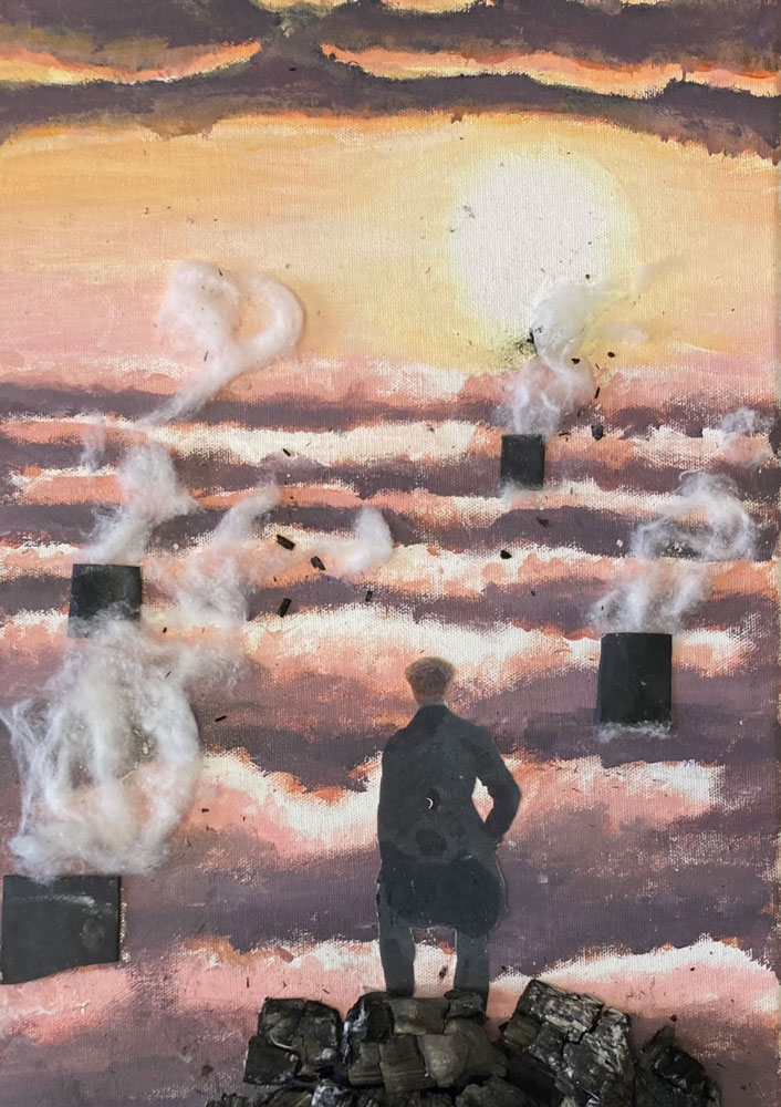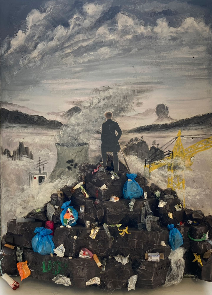 ein Themenschwerpunkt, der aktueller nicht sein könnte. Ausgehend von Landschaftsdarstellungen der Romantik sind, im Rahmen der Vorbereitung auf das Abitur, Werkstattarbeiten im Q2 Kunstkurs auf erhöhtem Niveau entstanden, die sehr persönliche, zeitgenössische Gegenentwürfe zu romantischen Landschaften zeigen. Suchte Caspar David Friedrich als Vertreter der Romantik in seinen Gemälden noch nach einem Leben im Einklang mit der Natur und Gott, so spielt der Mensch heute selber Gott und von einem harmonischen Miteinander von Mensch und Natur kann nicht mehr die Rede sein. So werden Collage, Assemblage, Malerei und Grafik in den Werken des Kurses ästhetisch überzeugend miteinander kombiniert und machen eine dystopische Welt sichtbar, die nachdenklich stimmen sollte.
