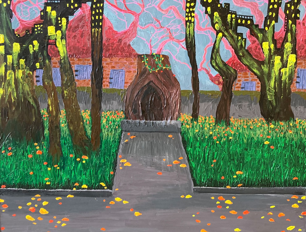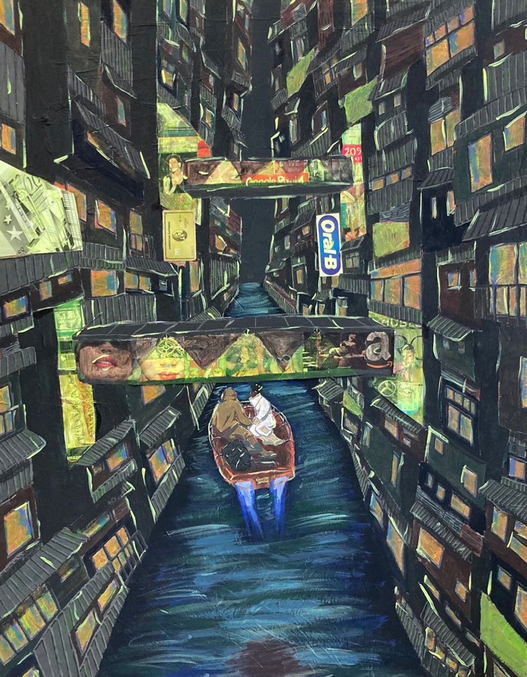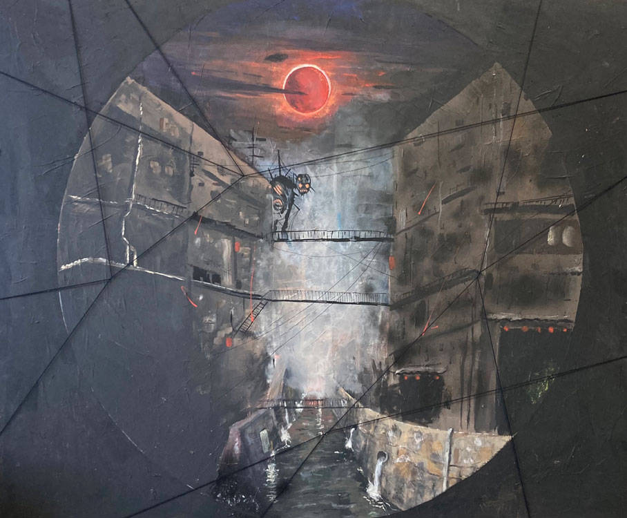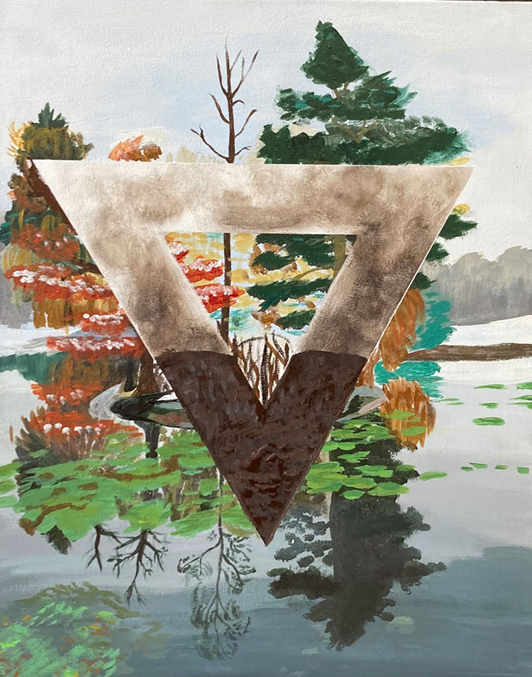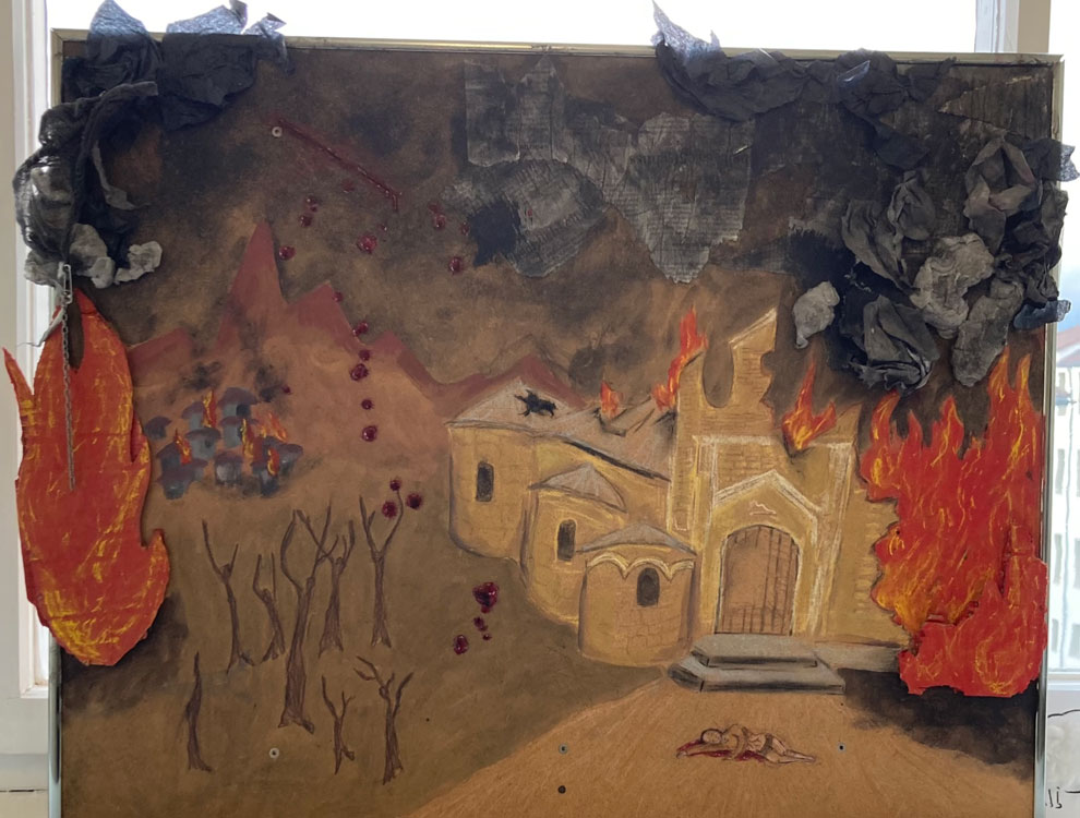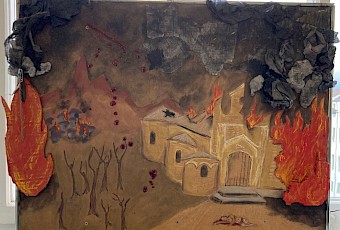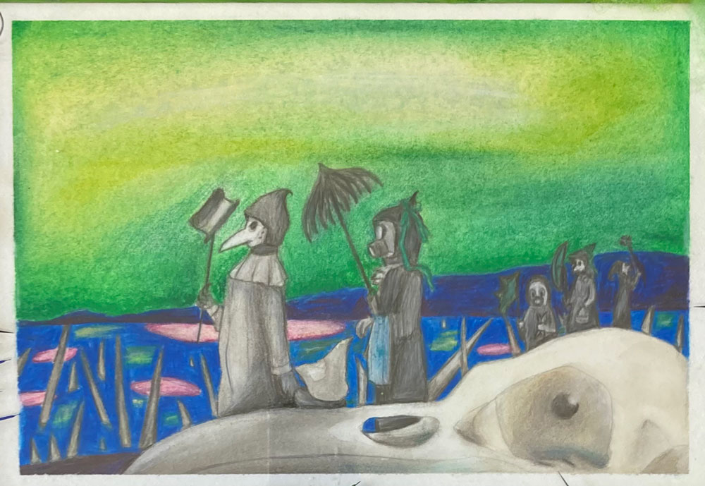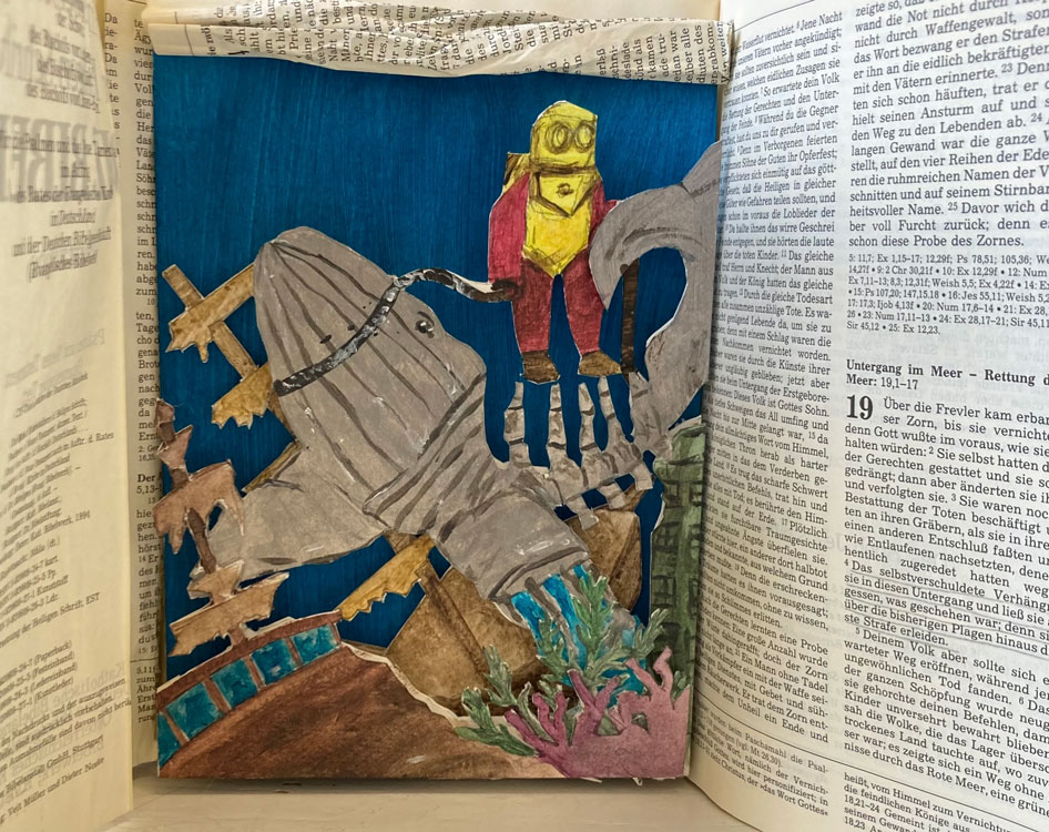 ein Themenschwerpunkt, der aktueller nicht sein könnte. Ausgehend von Landschaftsdarstellungen der Romantik sind, im Rahmen der Vorbereitung auf das Abitur, Werkstattarbeiten im Q2 Kunstkurs auf erhöhtem Niveau entstanden, die sehr persönliche, zeitgenössische Gegenentwürfe zu romantischen Landschaften zeigen. Suchte Caspar David Friedrich als Vertreter der Romantik in seinen Gemälden noch nach einem Leben im Einklang mit der Natur und Gott, so spielt der Mensch heute selber Gott und von einem harmonischen Miteinander von Mensch und Natur kann nicht mehr die Rede sein. So werden Collage, Assemblage, Malerei und Grafik in den Werken des Kurses ästhetisch überzeugend miteinander kombiniert und machen eine dystopische Welt sichtbar, die nachdenklich stimmen sollte.