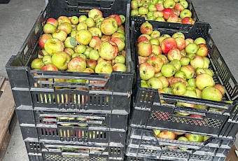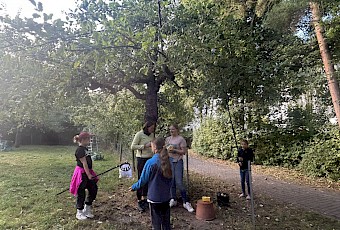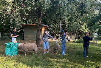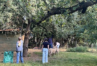 Die Garten-AG hat in Begleitung der 5 Schafe rund 300kg Äpfel geerntet. Daraus wurden ca. 175 Liter Apfelsaft gepresst.