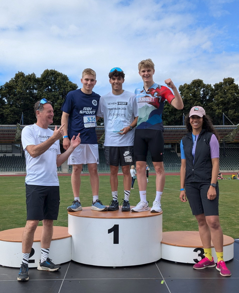 Beim traditionellen Volkstriathlon hat das FKG mit insgesamt 41 Finishern den ersten Platz in der Schulwertung belegt und wurde natürlich auch entsprechend geehrt. Sieger waren auch das Schulstaffelteam "Die Kettenreaktion" mit Moritz, Daniel und Linus (Q2) sowie Marte Hohmeier (5a3). Herzlichen Glückwunsch für diese tolle Leistung.