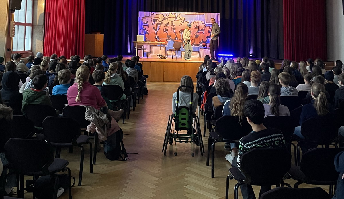 Ende November fand für die Jahrgangsstufe 7 die Theateraufführung „Fake oder war doch nur Spaß?” des Theaterensembles Radiks e. V. statt. Dank der großzügigen Unterstützung des Fördervereins konnte das Stück zu einem günstigen Preis an unserer Schule angeboten werden. Es beschäftigt sich mit den Themen Cybermobbing, Mobbing und Medienkompetenz und soll Jugendliche für die Gefahren und Folgen digitaler Kommunikation sensibilisieren.