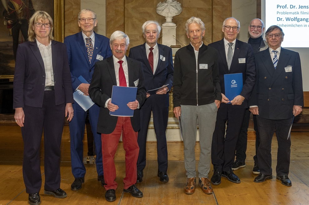 Ende November hat die Uni - wie alljährlich - ihre 'Goldenen Promovenden' des Jahrgangs 1975 mit einer Festveranstaltung geehrt. Und wie der Zufall es wollte, waren bei den sechs zu Ehrenden der Philosophischen Fakultät gleich vier ehemalige FKGler dabei. Auf dem Bild neben der Uni-Vizepräsidentin Prof. Anke Holler (ganz links), Dr. Thomas Häntsch (3.v.l.), Prof. Dr. Jens Thiele (5.v.l.), Prof. Dr. Wolfgang Buss (6.v.l.), und Dr. Wolfgang Zuse (ganz rechts).