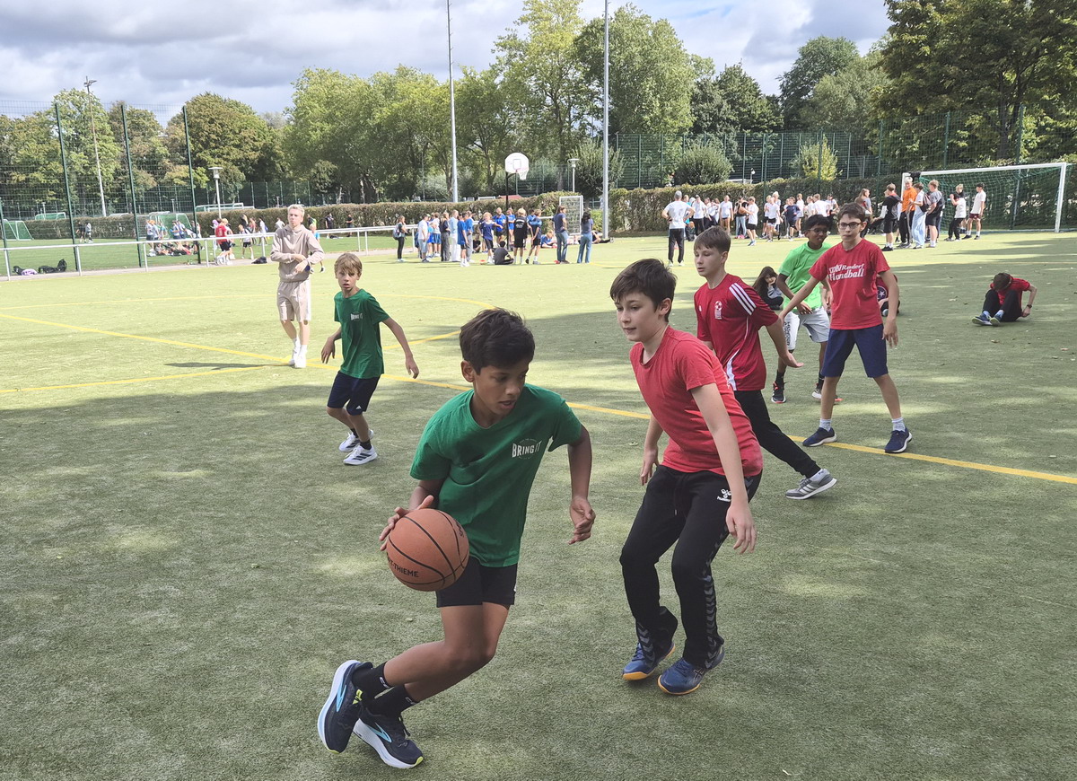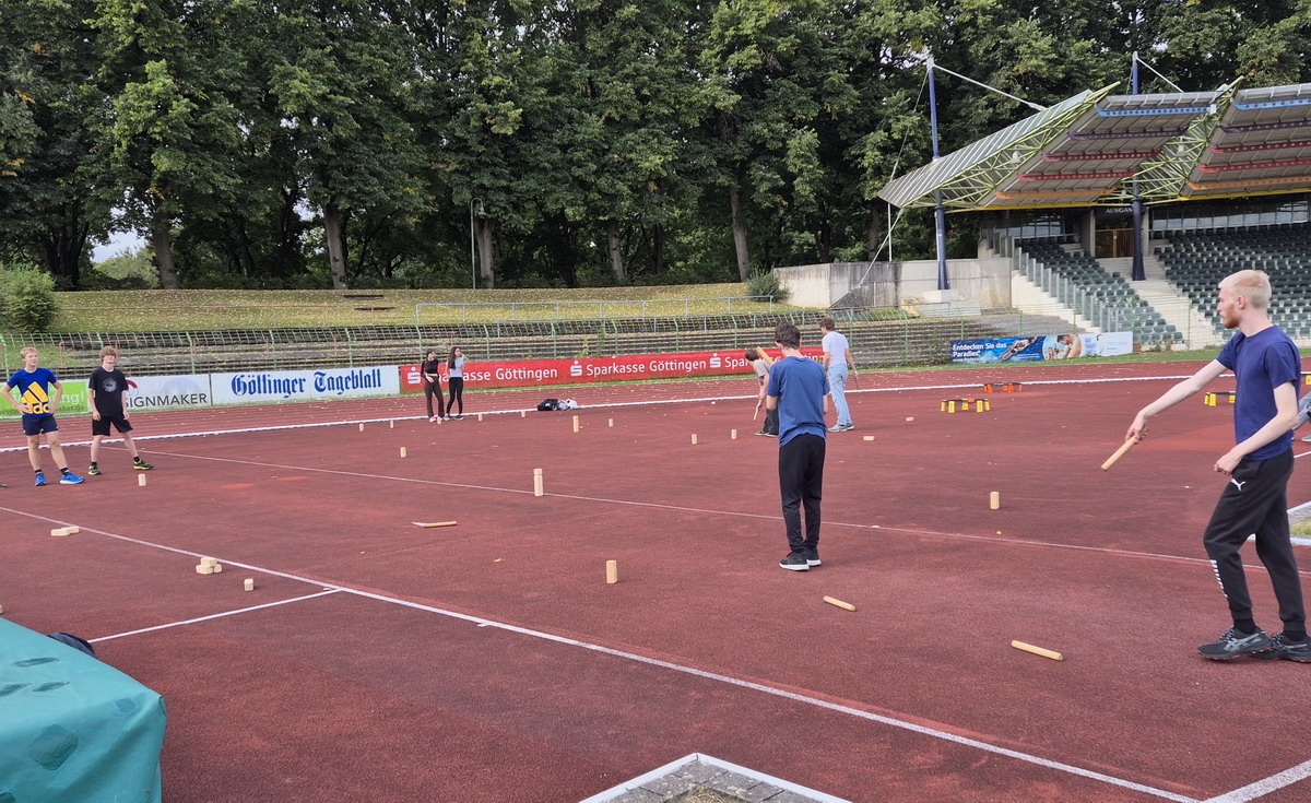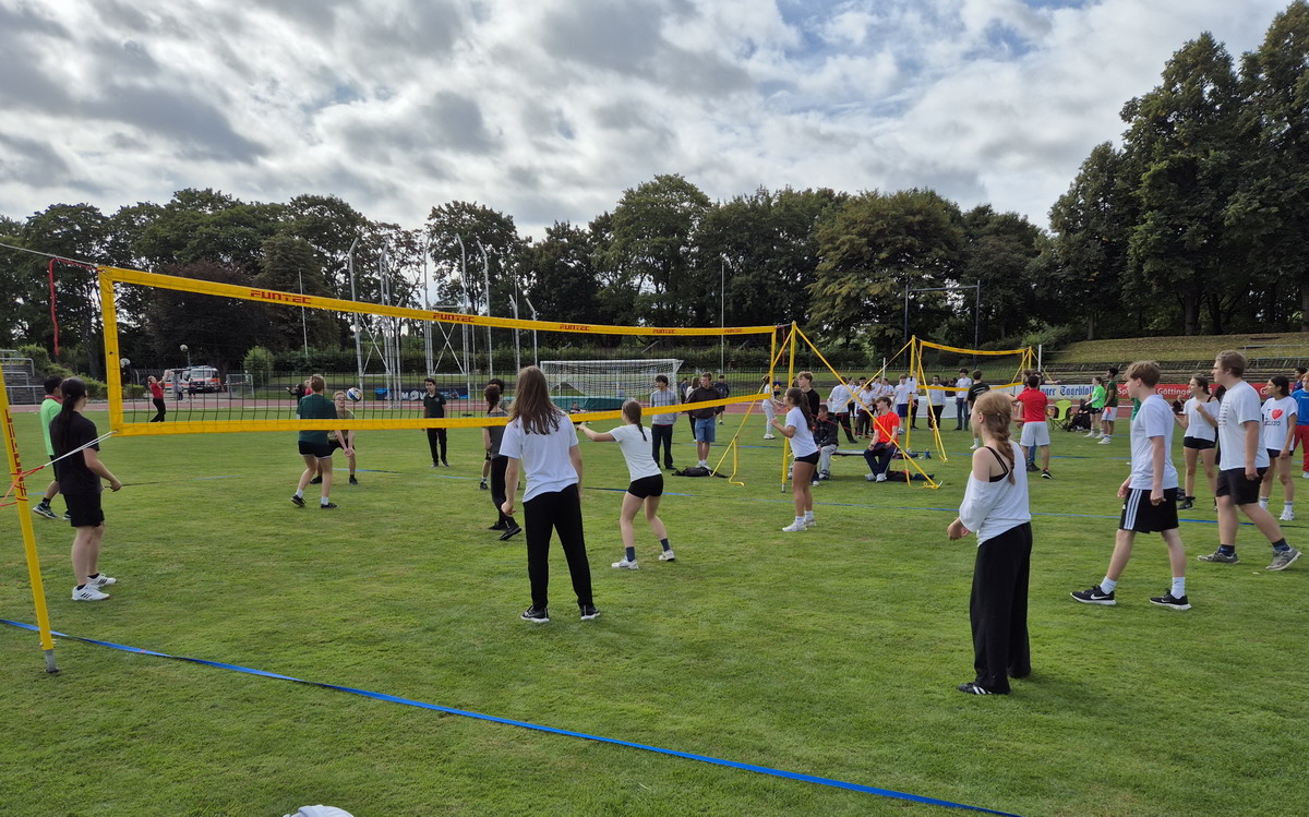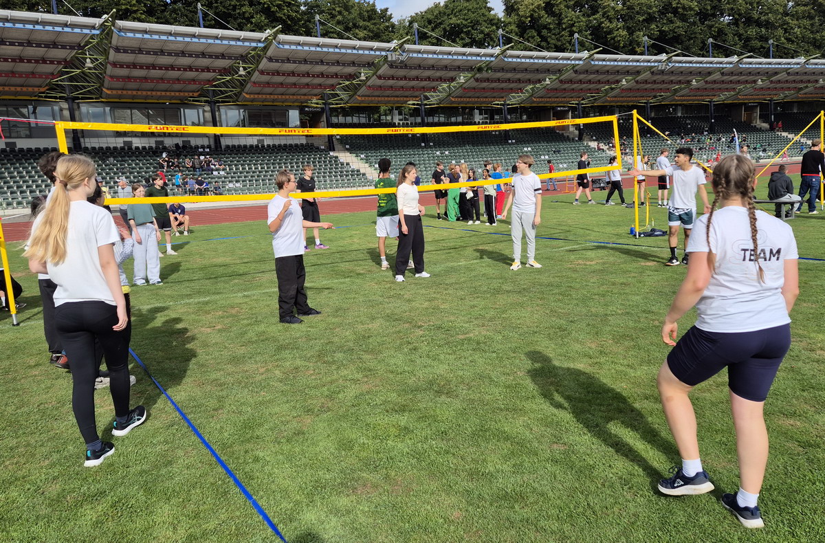 Das Wetter meinte es gut mit dem FKG-Sportfest im Jahnstadion und den Sportstätten am Sandweg. Die ganze Schule war mit den unterschiedlichsten Sportarten unterwegs, die Schülerinnen und Schüler gingen mit Elan und Ehrgeiz zur Sache. Der Schulsanitätsdienst und die Profis von den Johannitern sorgten für Sicherheit, die Q2 für das vielfältig zusammengestellte leibliche Wohl. Am Ende stand eine Siegerehrung, bei der neben den Tagessiegern auch die erfolgreichen Auswahlmannschaften unserer Schule gewürdigt wurden. Und eine La Ola.