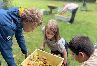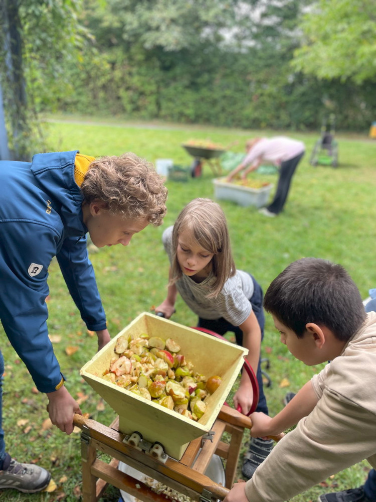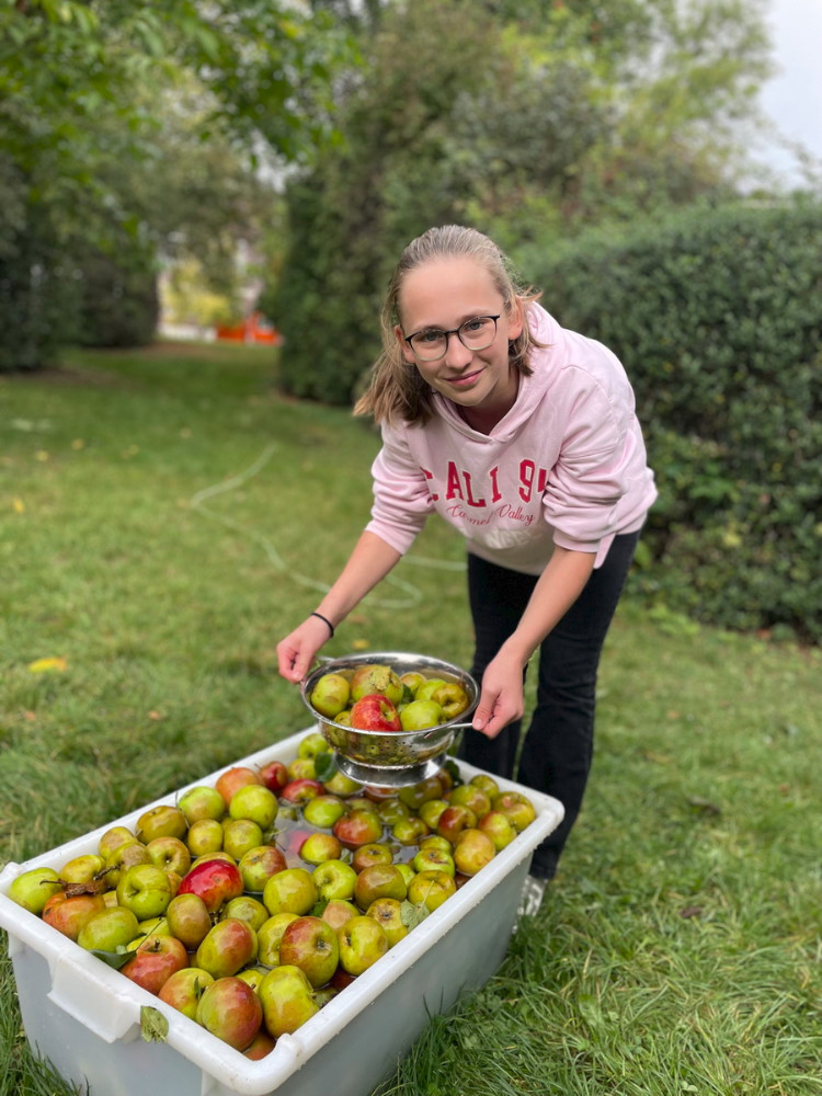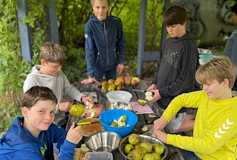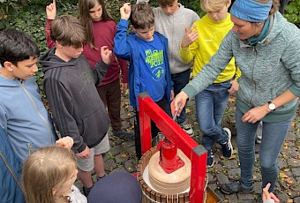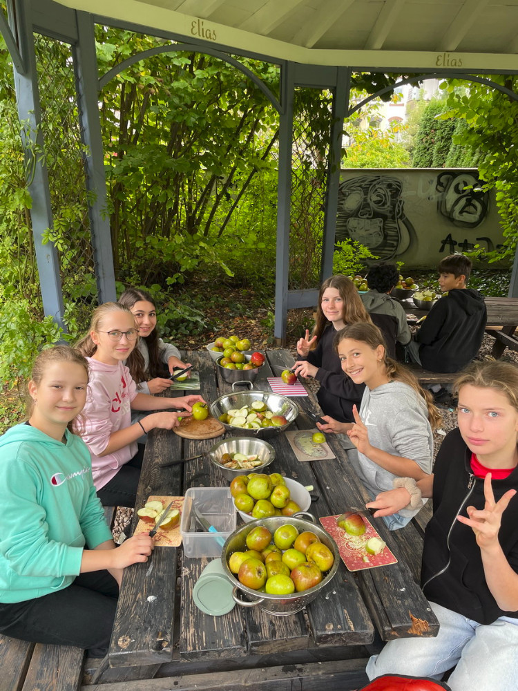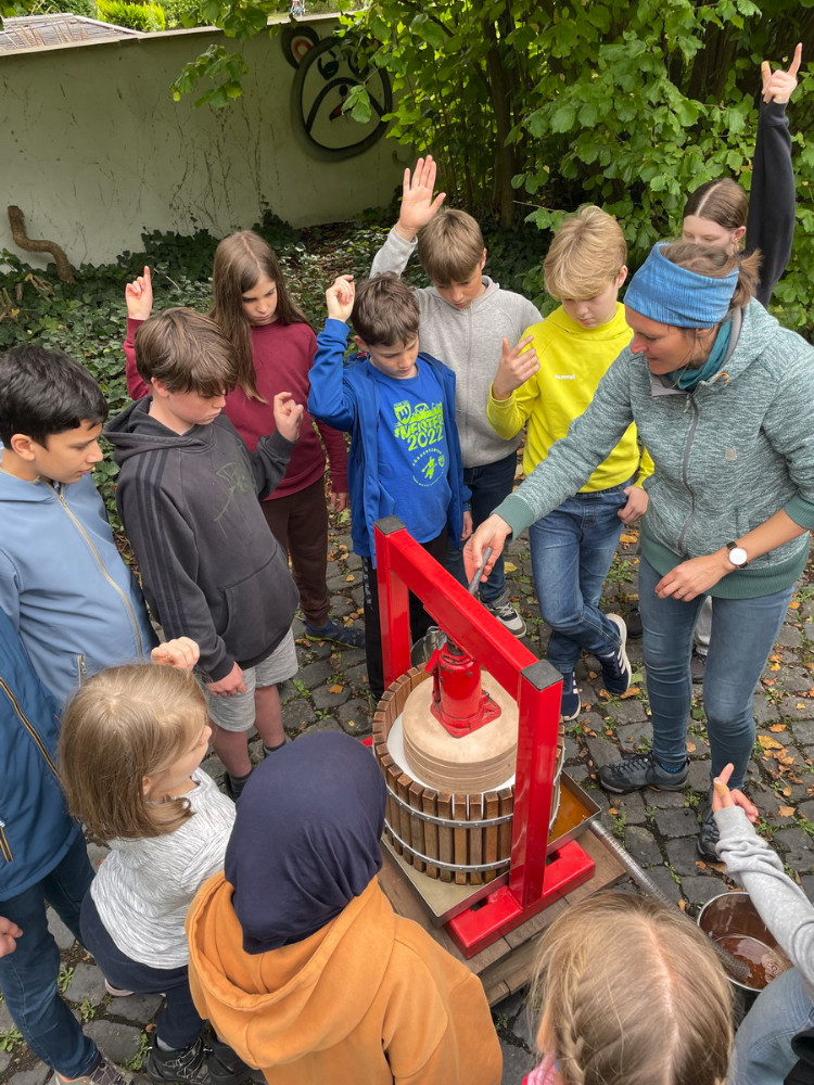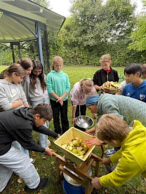 Ende September haben wir - die 7Mint - eine Streuobstaktion im Biologie-Unterricht bei Frau Wilken gemacht. Zu Beginn haben wir ein Nahrungsnetz mit einem Wollfaden dargestellt und die besondere Bedeutung der Insekten in diesem aufgezeigt. Danach haben wir vom großen Apfelbaum, der Sorte Boskop, viele Äpfel gepflückt und gesammelt. Diese Sorte eignet sich besonders gut zum Backen. Daraus haben wir dann Apfelsaft hergestellt, indem wir zunächst die Äpfel gewaschen, geviertelt, gemaischt und dann mit der Saftpresse gepresst haben. Ein Teil von uns hat parallel in der Schulküche zwei Apfelkuchen gebacken. Am Ende haben wir uns die zwei Kuchen und den Apfelsaft schmecken lassen. Die Aktion hat uns allen sehr gefallen.