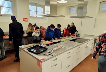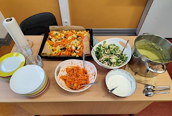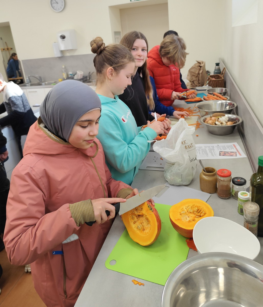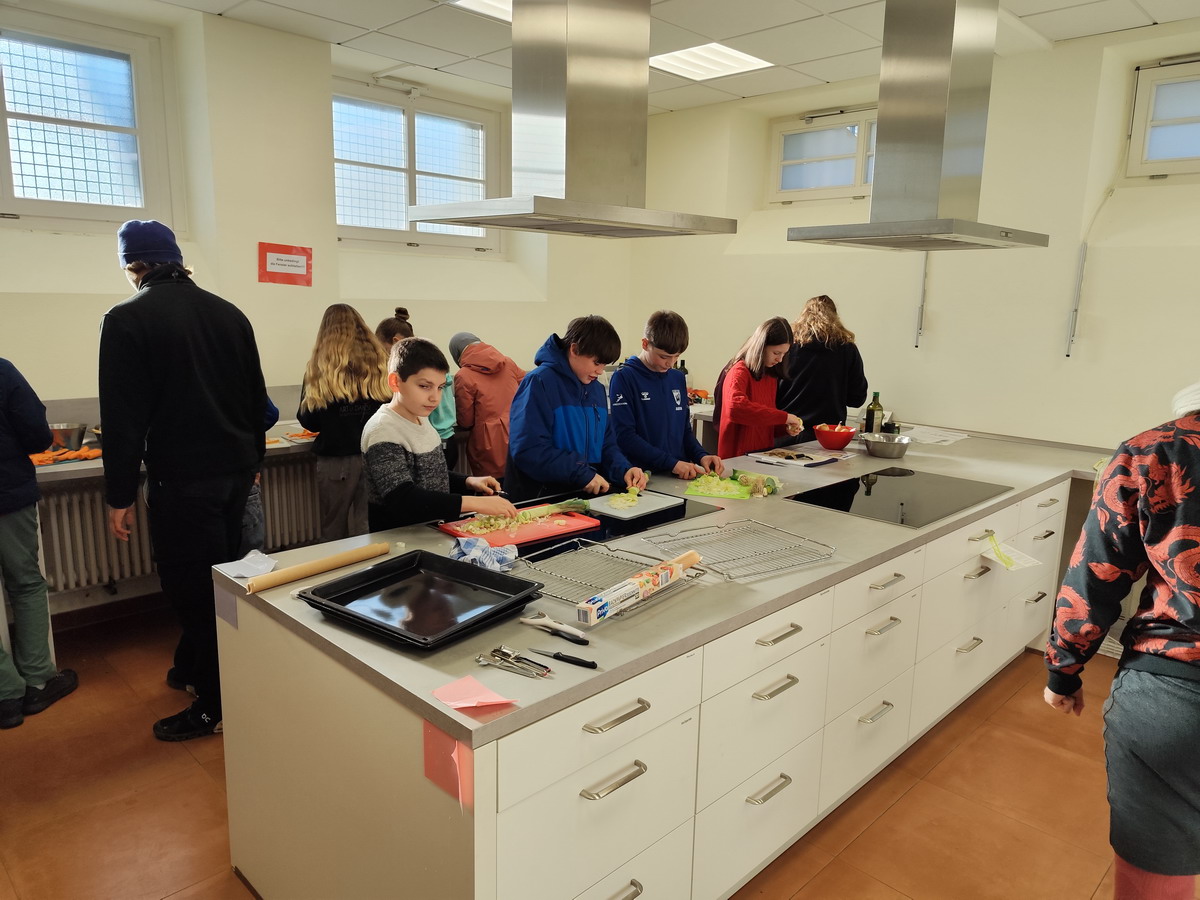 Der Höhepunkt des Projekttages war das gemeinsame Kochen eines eigenen Dreigängemenüs. Eine Gruppe hat einen Smoothie zubereitet, eine andere eine leckere Lauchsuppe gekocht. Als Hauptgang gab es Ofengemüse mit Dip und zum Nachtisch einen köstlichen Apple Crumble mit Vanille-Joghurt. Der Projekttag hat uns allen viel Spaß gemacht und wir haben dabei eine Menge Neues gelernt – und ehrlich gesagt hätten wir nicht gedacht, dass unsere Klasse so gut kochen kann. :-)