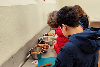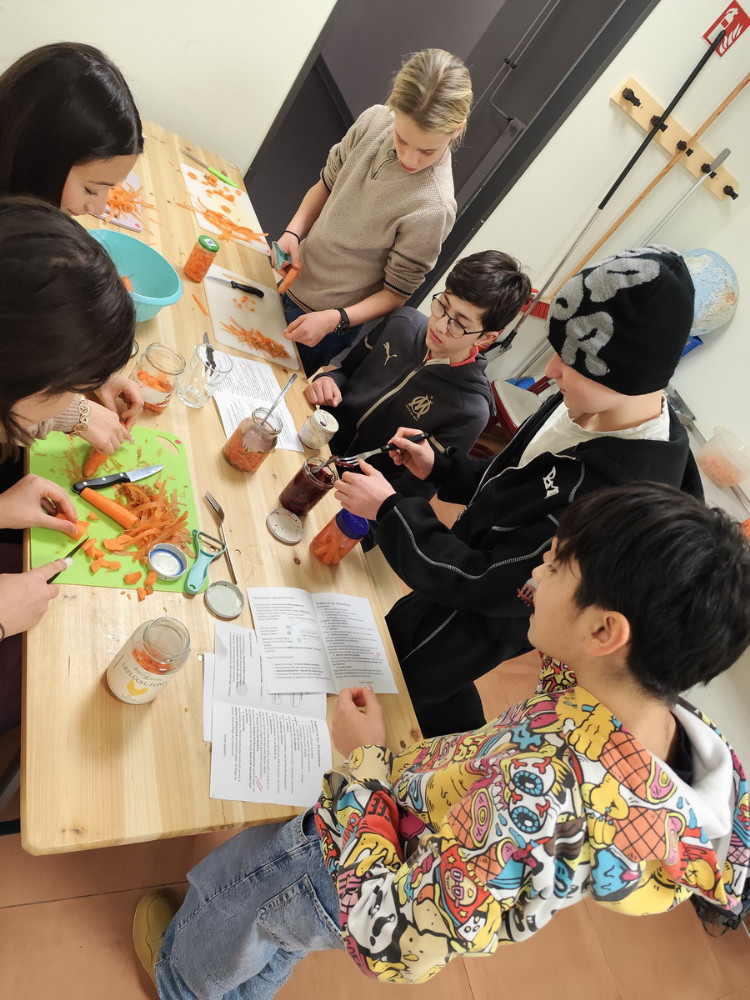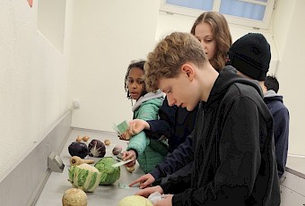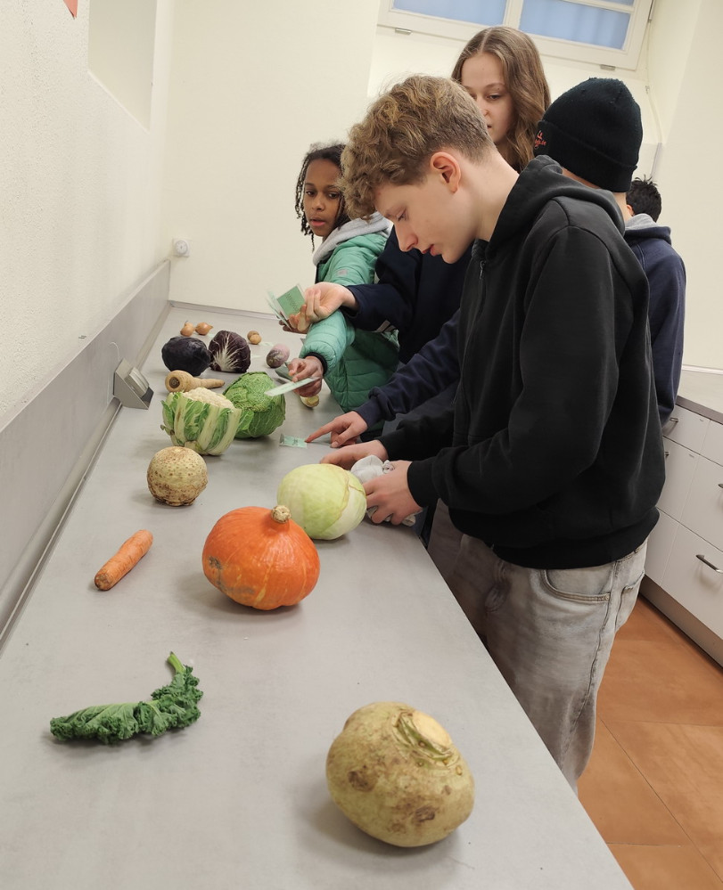 In der letzten Woche hatten bereits die achten Klassen ihren Projekttag rund um gesunde und klimafreundliche Ernährung. In dieser Woche waren dann wir, die siebten Klassen, an der Reihe. Zu Beginn wurden wir in vier Gruppen eingeteilt und sind anschließend durch verschiedene Stationen gelaufen. Dabei haben wir unter anderem gelernt, wie man Lebensmittel fermentiert, und durften verschiedene Sorten von Wintergemüse probieren. Außerdem haben wir uns mit dem CO₂-Fußabdruck beschäftigt und viel über unterschiedliche Wintergemüsearten erfahren.