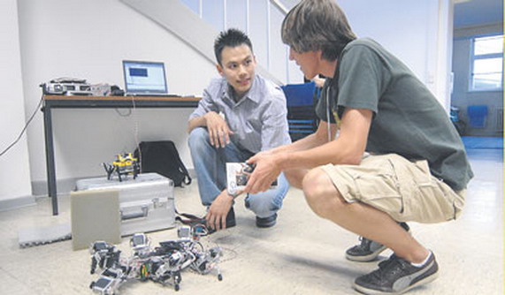 Das Wissenschaftsjahr 2006 steht im Zeichen der Informatik. An 14 Universitäten werden Errungenschaften und Zukunftsvisionen der Informatik vorgestellt. Eine dieser Aktionen war die bundesweite „Nacht der Informatik", die am Freitag im Institut für Informatik und in der Niedersächsischen Universität- und Staatsbibliothek (SUB) stattfand. Unterstützt vom Felix-Klein-Gymnasium präsentierten das Institut und die SUB die Fachwissenschaft und ihre Bedeutung für das alltägliche Leben. Mit Vorträgen, Workshops, Vorführungen und Mitmachaktionen gab die „Nacht der Informatik" in Göttingen – auf Initiative von Prof. Dieter Hogrefe – einen Einblick in eine zukunftsweisende Wissenschaft. Auf den ersten Blick erinnert der Gegenstand am Boden des Übungsraums im Institut für Informatik an ein Insekt. Dicht am Boden bewegt es sich auf sechs Beinen vorwärts. Nur besteht es eben aus Kabeln und Metall und überschreitet eindeutig die Dimension eines jeden Insekts. Der Vergleich ist dennoch nicht unberechtigt: Denn es handelt sich um einen biologisch inspirierten Laufroboter des Doktoringenieurs Poramate Manoonpong. Seit Anfang 2006 arbeitet Manoonpong für das „Bernstein Center for Computational Neuroscience" in Göttingen zudem an der Weiterentwicklung des schnellsten Laufroboters der Welt, welcher sich wie ein Mensch auf zwei Beinen fortbewegt. Nun soll dem Zweibeiner auch das Bergauflaufen sowie das Gehen ohne Stütze beigebracht werden.